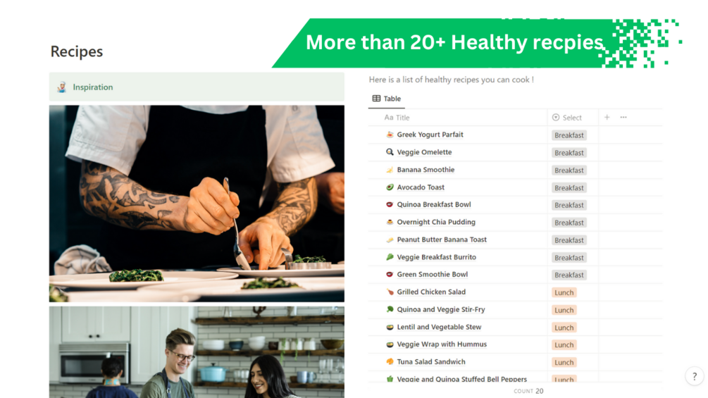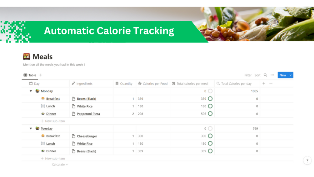 Healthify is a comprehensive Notion template that empowers you to effortlessly keep track of your daily meals and automatically calculate the calories you consume, helping you make informed decisions about your diet. With its user-friendly design and powerful features, Healthify makes meal tracking a breeze, making it easier than ever to achieve your health and fitness goals. 🥗📊🍳